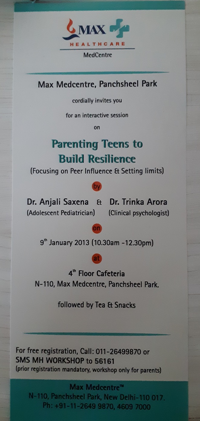 - At Max Super Specialty Hospital, Saket, on topics “Pregnancy and Childbirth: A Psychological Perspective” and “Stress Management and Relaxation during Pregnancy” (August 2008-August 2009)