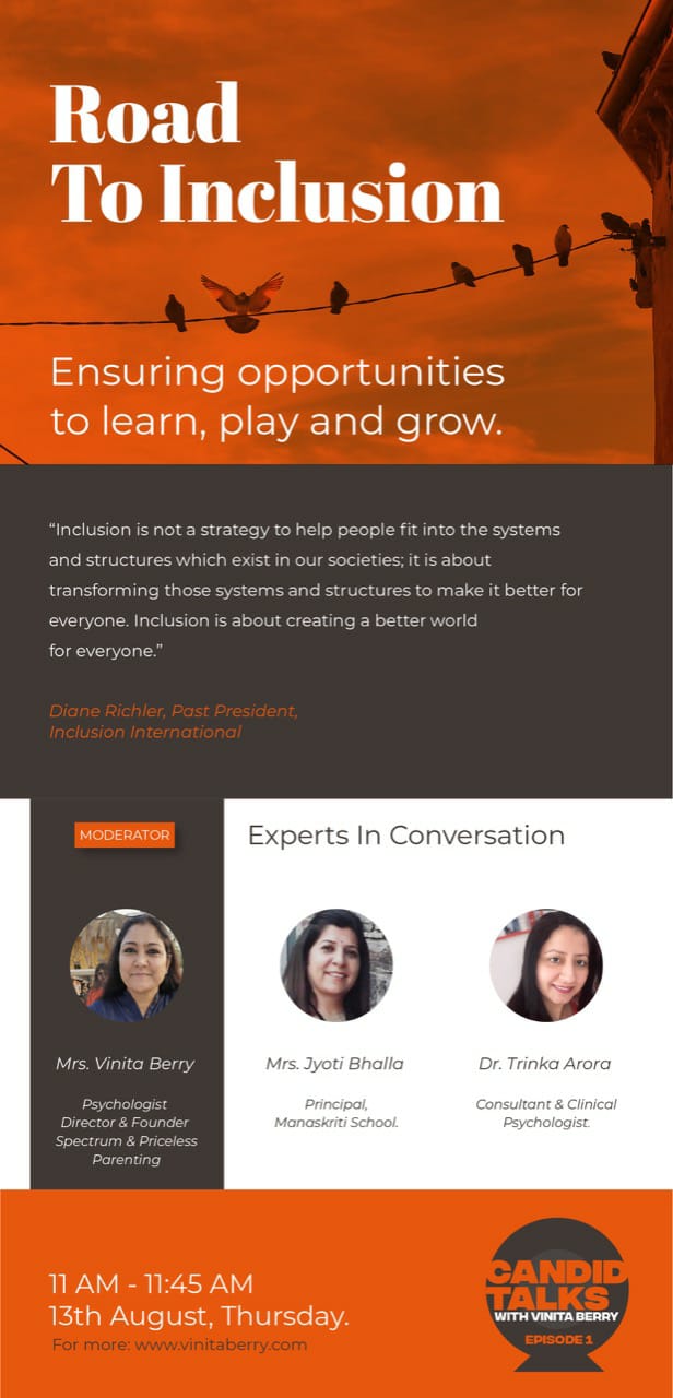 Candid Talks with Vinita Berry Episode 1: “Road to Inclusion” with the eminent panelists Mrs.Jyoti Bhalla and Dr.Trinka Arora (August 13, 2020)